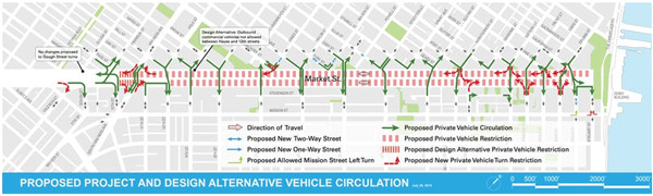 该图显示了允许车辆穿过市场街的位置。图片由Better Market Street提供。