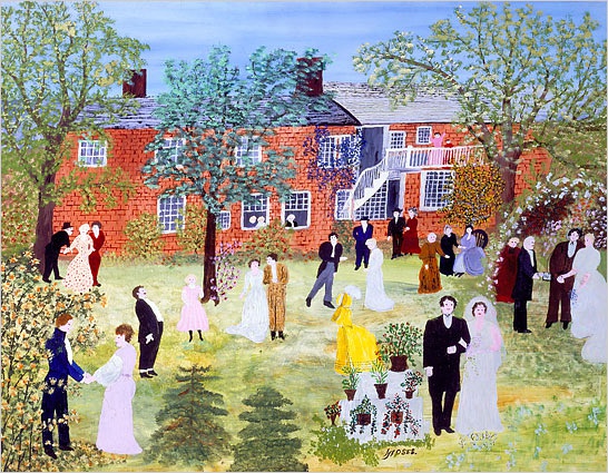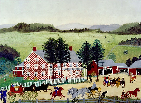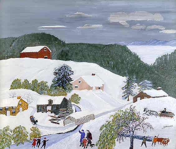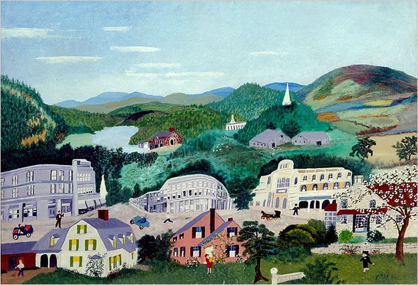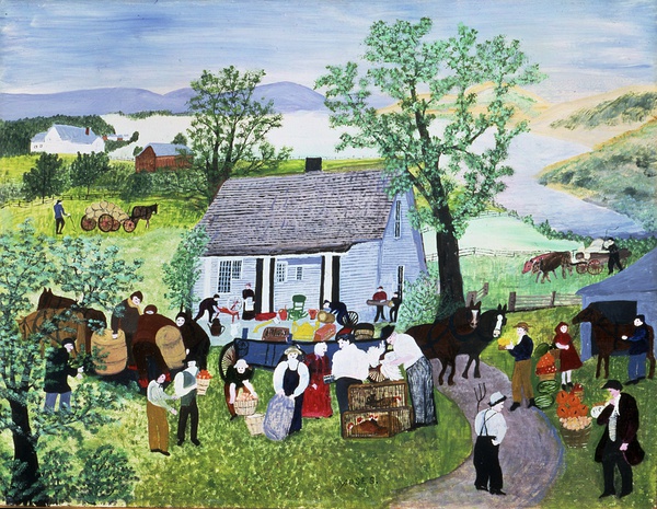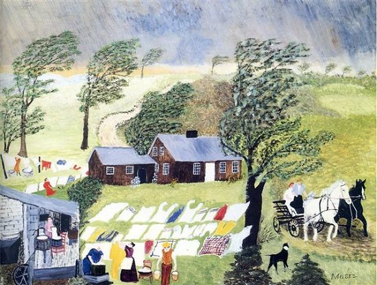 虽然她从未接受过正规的艺术训练,但对美的热爱使她爆发了惊人的创作力,在二十多年的绘画生涯中,她共创作了1600幅作品。 摩西最早的绘画是柯里夫和艾夫斯图片和明信片的临摹品。不久她根据对农场的早期生活回忆而创作,主要描绘是童年时的乡村景色,喜作全景风景风俗画。