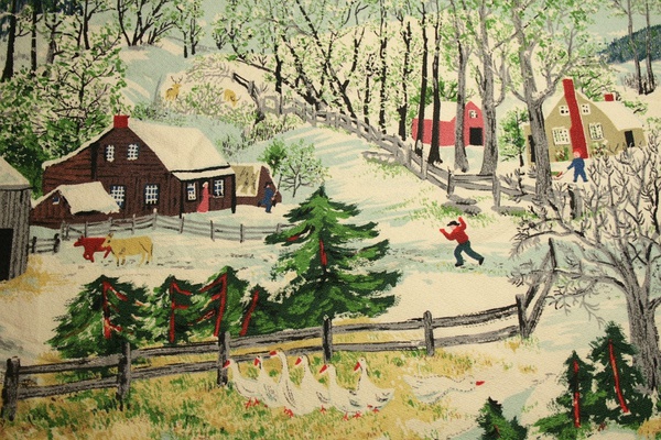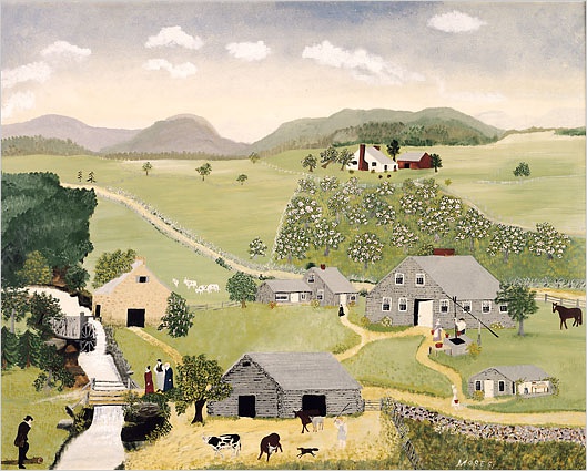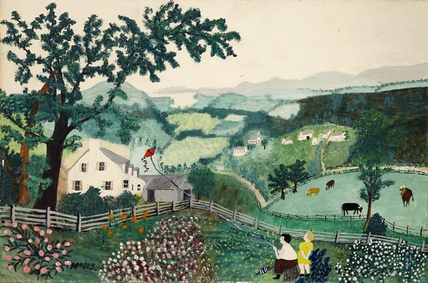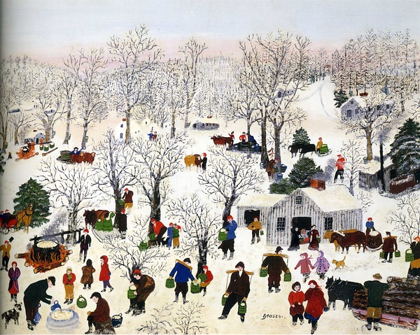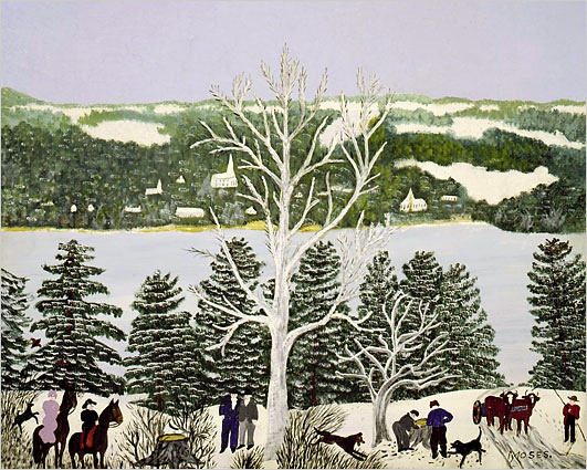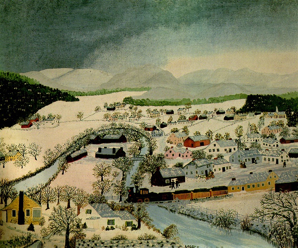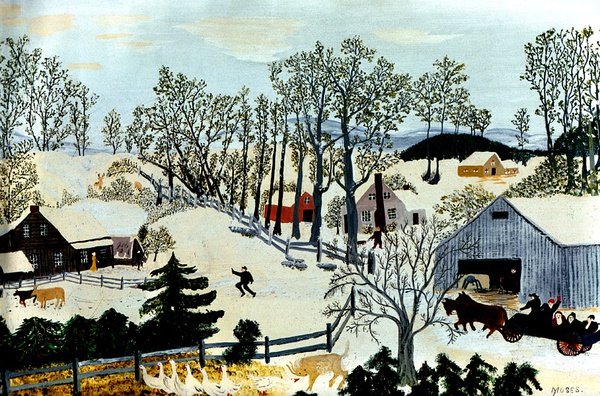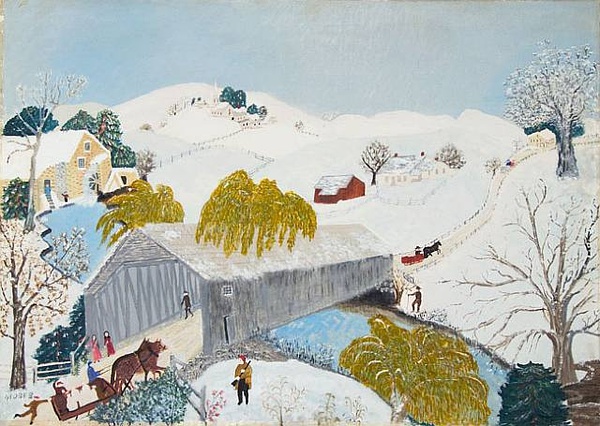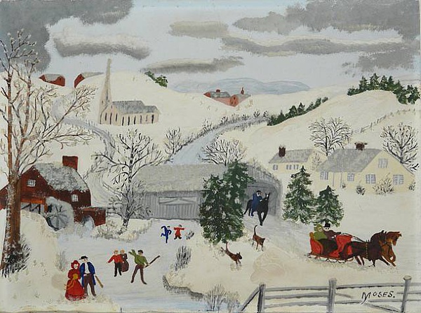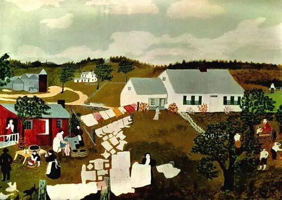 摩西的风景画能敏锐捕捉到季节、天气和时间的细微差别。她的作品并不仅仅是个人生活的记录和对过往的伤感怀旧,她描绘的是永恒的东西。摩西的作品多使用怀旧的标题,如《感恩节前捉火鸡》、《过河去看奶奶》等。