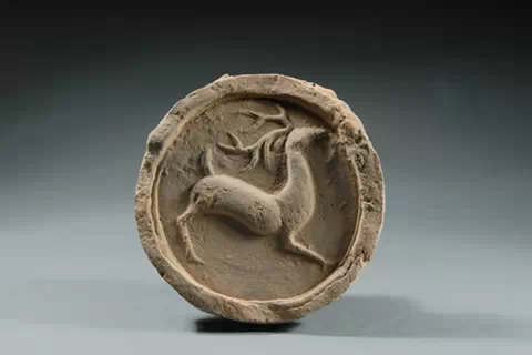 图为“松鼠吃葡萄”图案的瓦当,寓意捷报丰收