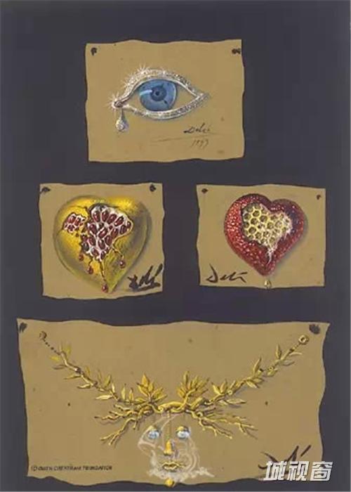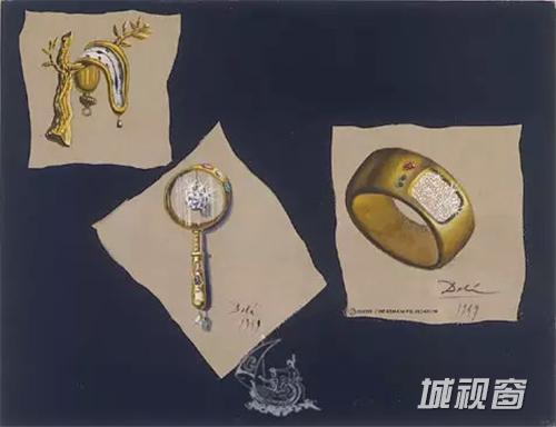 达利设计珠宝的手稿:左一是达利代表作“记忆的永恒”里融化的表