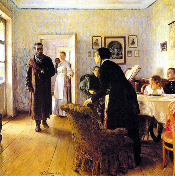 这是画家创作鼎盛时期的一幅作品。列宾抓住流放者跨进门坎的一瞬间,他及每个家庭成员的表情、行为向人们展示惊喜、意外和各种复杂的感情。如果我不把故事背景讲给大家的话,一定有人会把这幅作品的含义想偏……