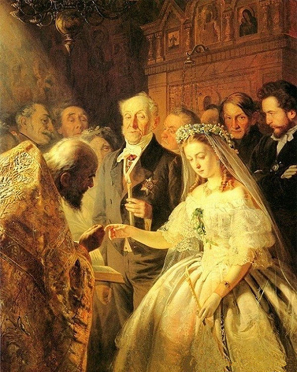 该画描绘了一青春少女与一老者结合的爱情悲剧。老者被画家描绘得苍老憔悴,而少女则面色红润,充满青春活力。画家以同情少女的笔调,鞭挞了不合理的社会现实。