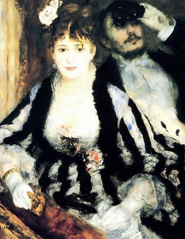 画家成功地表现了剧院中包厢里的气氛,虽然只画了两个人,但画家明显地突出了那个贵妇人的形象,化了妆的贵妇人与身后的绅士形成鲜明对比。