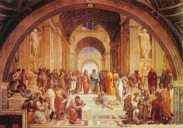 全画以纵深展开的高大建筑拱门为背景,大厅上汇集着不同时代,不同地域和不同学派的著名学者。作者希望以回忆历史上黄金时代的形式,寄托他对美好未来的向往。