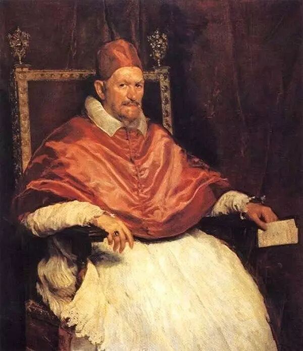 该画或许是作者最为杰出的一幅肖像,画中人物是1644年登基的罗马教皇。在当时人的笔记中,这位教皇似乎并没有给人们留下好印象,他甚至被认为是全罗马最丑陋的人。据说,他脸长得左右不太对称,额头也秃秃的,看上去有点畸形,而且他的脾气也是暴躁易怒。然而就是这样一个难看而阴郁的人在委拉斯开兹笔下却成为一绝佳作品。当这幅肖像送给教皇时,教皇惊讶而不安地说了句“过分像了”。