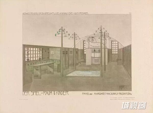 格拉斯哥派代表人物麦金托什与妻子画下了这个儿童房间的构想蓝图。这个房间也是为艺术爱好者的父母设计,也伴随当时认为孩子的艺术感受力培养应该是在家中。屋内的地板、设计细节图形化,灯光拥有树木的结构,为孩子在一个类似童话世界的空间中打开对艺术表现的启蒙。
