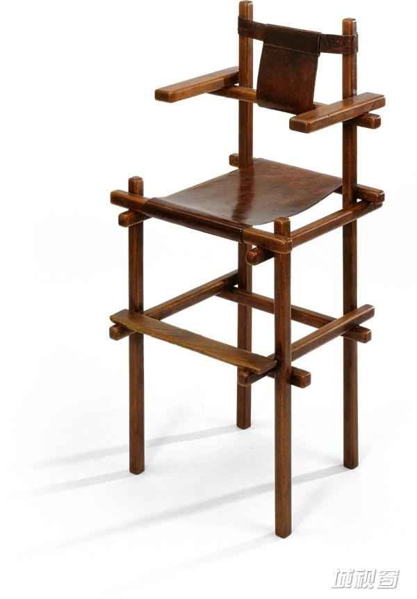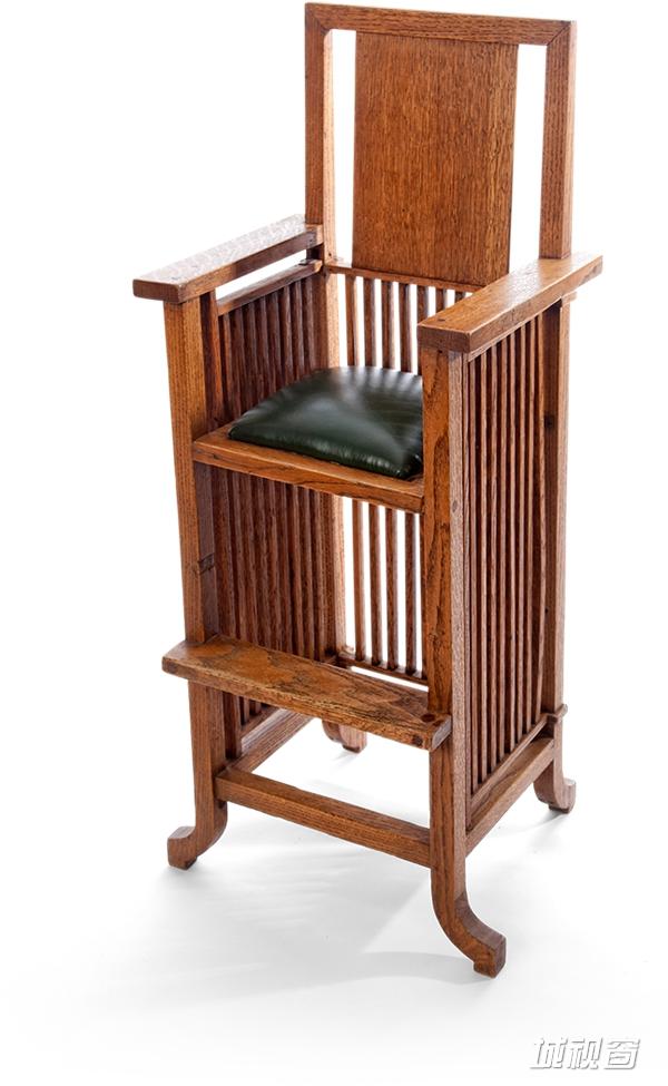 这把椅子是建筑师最初为自己在伊利诺斯的家设计的,为了给孩子一个舒适又安全、坐着吃饭的座位。主体采用橡木,坐面为皮革。