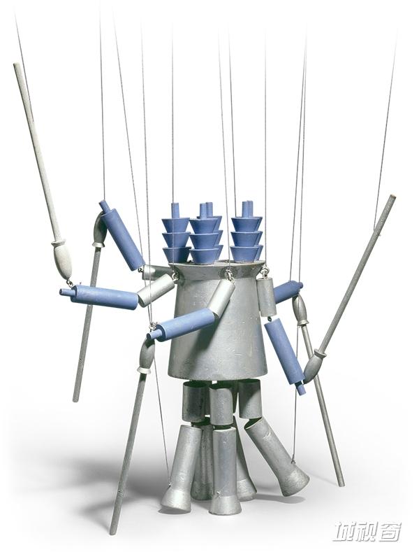 Taeuber-Arp创作了一系列木偶玩具,有一种圆形和雕塑感,通过螺栓连接细线控制。木偶是两次世界大战期间流行的一种艺术形式,不少创作者带来各类木偶之作。而Taueuber-Arp是当时瑞士木偶剧院委员会的唯一女性成员,她的木偶玩具带有先锋风格。