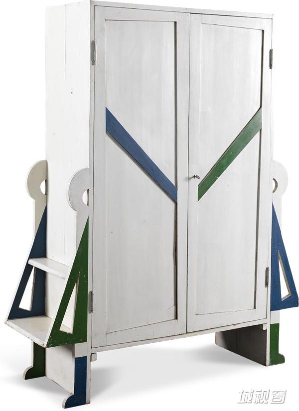 几何式的装饰在这个衣柜的侧面,可以让孩子爬上爬下。这件作品是Balla当时一系列带有意大利未来主义风格的内饰和玩具创作之一,充满实验性,也是当时对产业速度提升大背景下的一种未来式畅想。