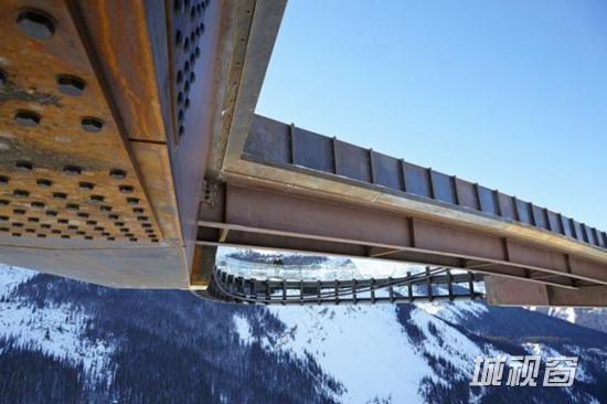 抛物线悬臂采用由热处理过的玻璃打造的玻璃地板清晰地向人们展示了下方景观。压力和拉力构件的反作用力使悬臂结构保持平衡,因此不必再设计桥塔和缆线等更加传统的上层结构。耐老化性以及与变化的山间景色间的关系使建筑师选择了耐候钢。露头钢质地将老化;阿萨巴斯卡冰川的大小将改变。两者都会随着时间而变化,留下岁月的痕迹。项目于2014年5月向公众开放。