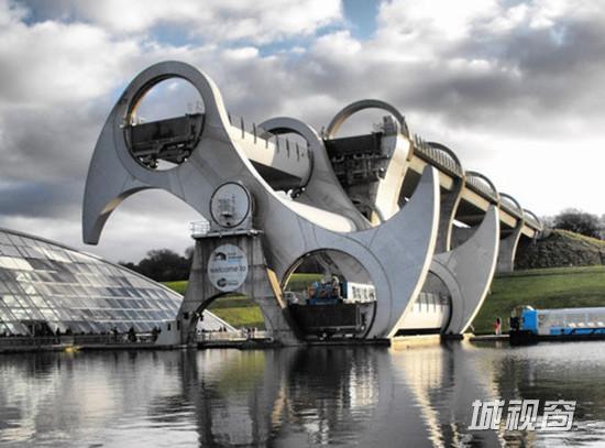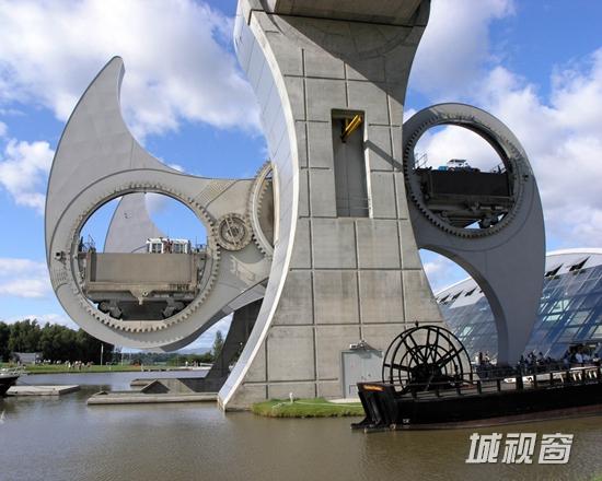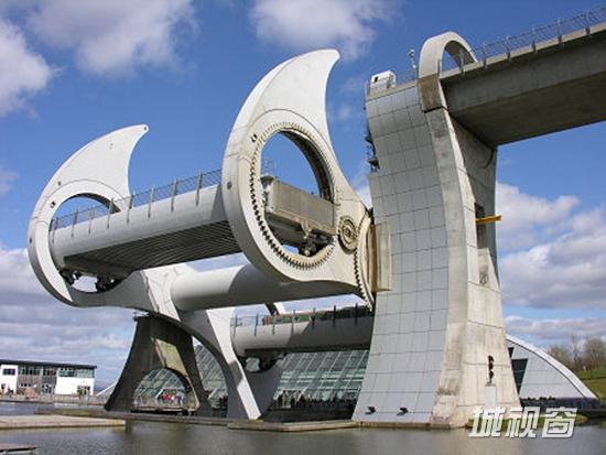 这座旋转轮桥可以说是船只的电梯,将福斯河(the Forth)、克莱德河(Clyde)和联盟运河(The Union Canals)连接起来。大转轮可以将船抬升79英尺(24米),这是世界上唯一的旋转升船机。转轮的最大直径为115英尺(35米)。