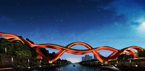 梅溪湖梅岭公园体育公园步行桥长183.95米,总宽11.5米,最小通行宽度2.5米,相对高度20.425米,位于长沙西郊梅溪湖梅岭公园南侧。方案设计源于中国传统的文艺形式——中国结,也加入了无限循环——莫比乌斯环的结构特征,寓意于此地区是当代中国不断突破发展的代表。