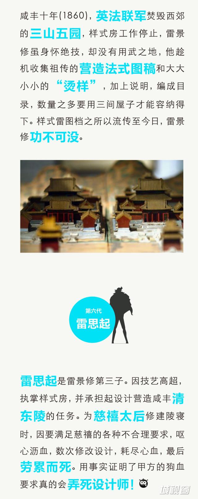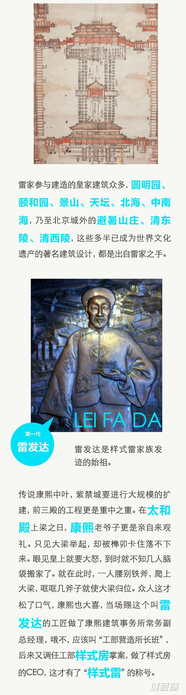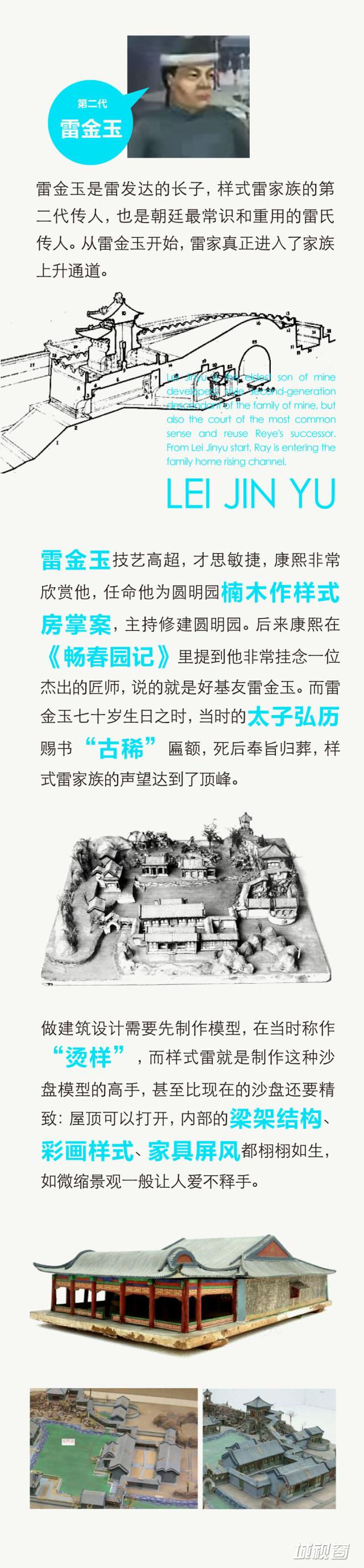 据了解,“样式雷”家族来自江西,是一个很古老的家族。明末清初动乱的时候,他们家族在南京住着,后来三藩基本平定以后,这个家族就有人到北京。其中就包括雷发达和雷发宣,他们带着自己的子女,就住在海淀。他们在南方的时候就用楠木盖楼、装修、做家具,来到北京后就通过自己的手艺干活儿。康熙二十二年,雷发达来到了北京,参加了清廷宫禁营建,于康熙三十二年去世。继他之后,包括雷金玉、雷家玺、雷景修、雷廷昌等雷氏子孙继续着祖辈的事业,长期主管着样式房的工作。