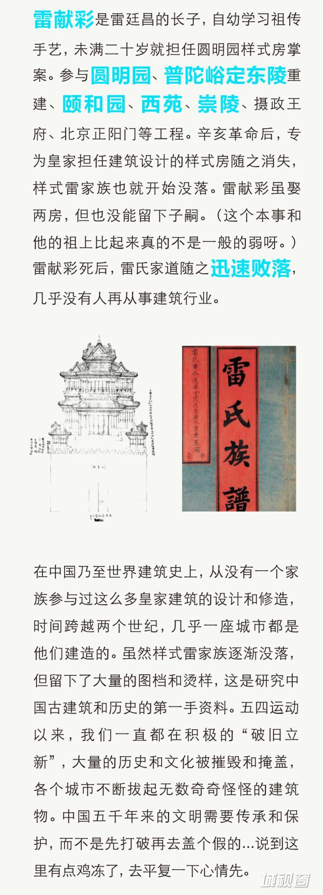 “样式雷”在第八代传人雷献彩之后就开始没落了。因为辛亥革命后,作为皇家建筑设计的样式房差务也就随之消失。雷献彩也没能留下子嗣。他在经历着失业的痛苦时,还要忍受无人后继香火的悲哀,双重打击使得这位末代“样式雷”郁郁而终。