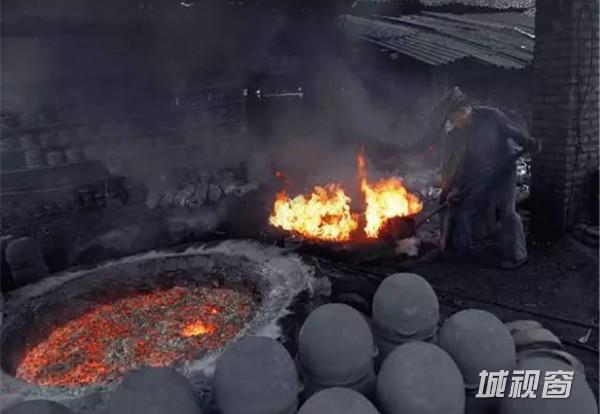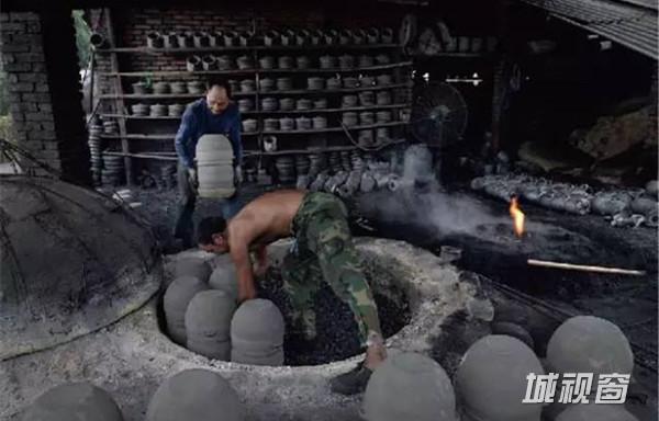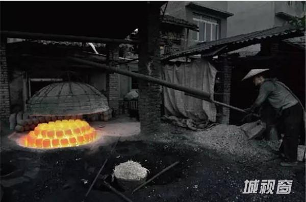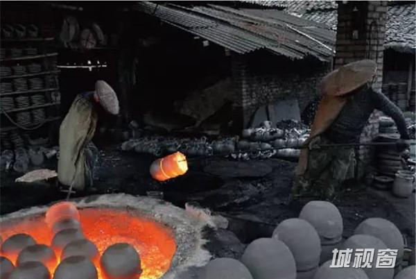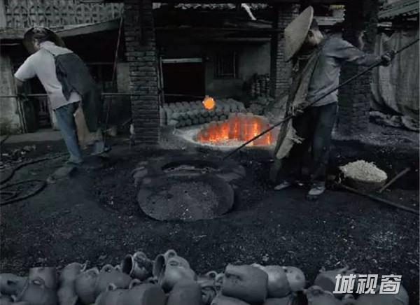 砂锅在火光之中被烧得通红,烧窑师傅手持一只长钩,迅速的将砂器钩到另一个窑中上釉。