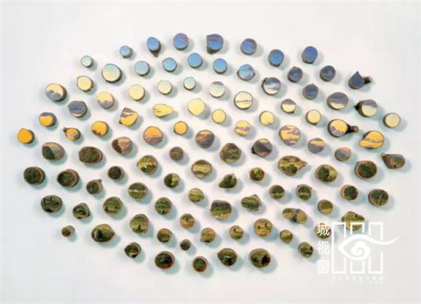 《征服》,1998,描绘了夕阳下的被人类砍伐后留下的树桩,由102段枫树和桦树树桩组成。