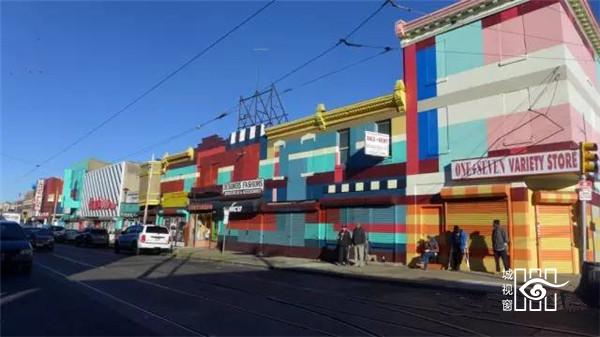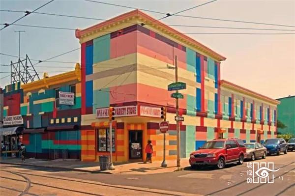 在费城,“我们和当地的店家和房主,还有十来个年轻人,一起做出了这些设计。和他们一起,把他们自己的社区、整条街道,改造成了一幅巨大的色彩拼接图。”