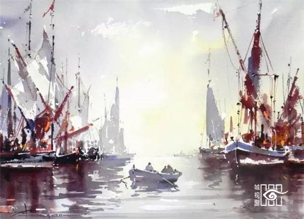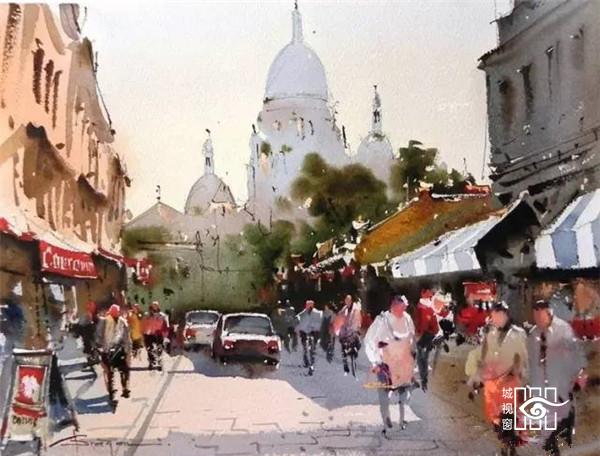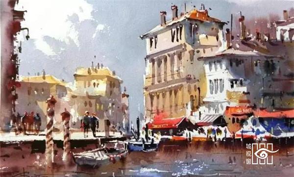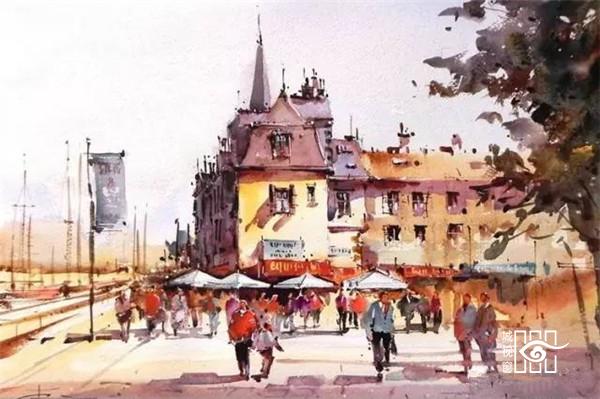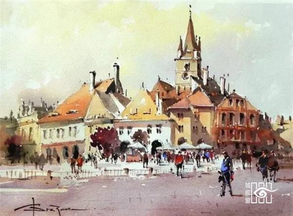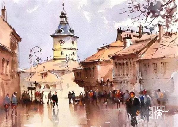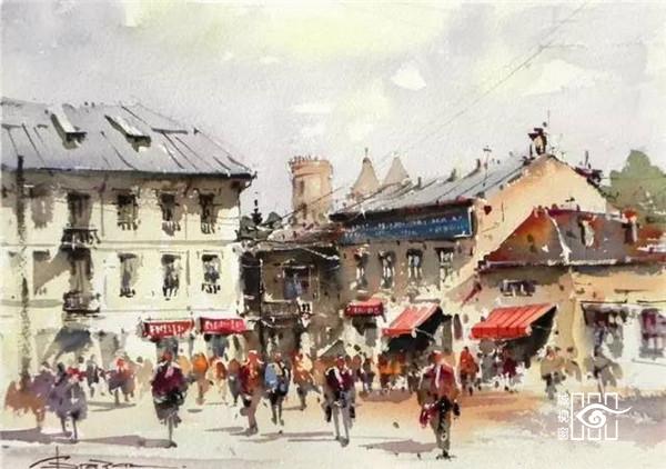 罗马尼亚德拉戈米尔·奥库卡,水彩画,画面色彩丰厚,光感强烈,层次丰富,手法明快,娴熟的概括力表达出热烈的街头场景,体现了浓郁的生活气息……