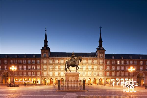 马约尔广场是菲里普三世在1619年主持修建的,有着独特风格的四方形广场。横向128米,纵向94米,由4层高的建筑围成。在广场中央是菲里普三世的骑马雕像。以前在周围住户的阳台上经常可以看到奢华的皇家仪式、斗牛以及种种纪念活动,甚至是宗教裁判所施行的火刑现场的这座广场上,现在回荡的是抱着廉价吉他的年轻人们的嘹亮歌声。