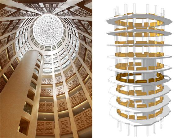 石头多孔的特性被设计师转化为连接各功能空间的中空建筑结构,包括行政中心、学习信息中心、培训中心和学生活动中心。中空构造同时促进了 建筑和使用者及周围环境的交流,成为建筑与人、景互动的桥梁。不同高度的中空在建筑内部创造了一个三维的苏州园林,同时通过中空构造引进自然光线和促进通风。