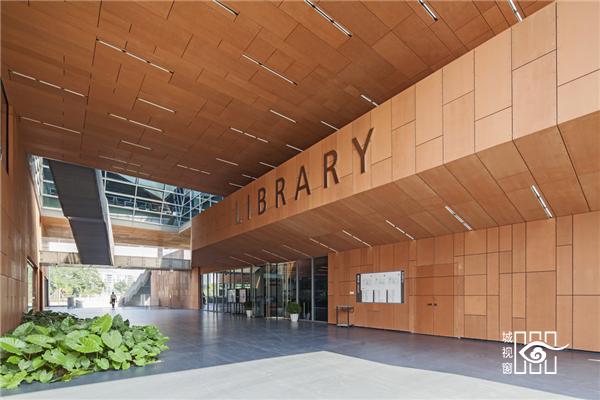 主入口门厅、学术报告厅、社团活动室和书吧等公共功能被有意安排在南北向通廊的两侧。二层游廊自西向东途经书吧、天井、多功能厅、竹园、阅览区、半室外台地,最终到达东面的百树园。流线交叉给人们的日常穿越带来相遇和交流,停留、阅览和参与学术生活自然成为生活的一部分。使实体图书馆有机会比虚拟阅读更鲜活有趣。顶层是供开架阅览使用的近3800平方米的开敞式大空间。橘色主题从室外公共空间延续至室内的公共区,将人们自然地从游廊引入到建筑中来。
