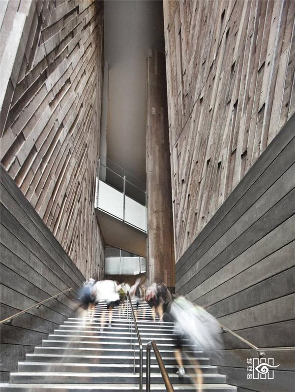 Lyons 这是由堪培拉澳大利亚国立大学的建筑师Lyons设计的X型台阶,由木头制成,外罩有一层百叶窗。这个台阶将这座科研中心的两翼——两个实验室连接了起来。Lyons说这两个实验室本是独立的个体,这个台阶将两者合二为一,融为一个整体。办公室位于实验室对面,每层都有两排窗,低的那排有桌子那么高,高的那排有天花板那么高。