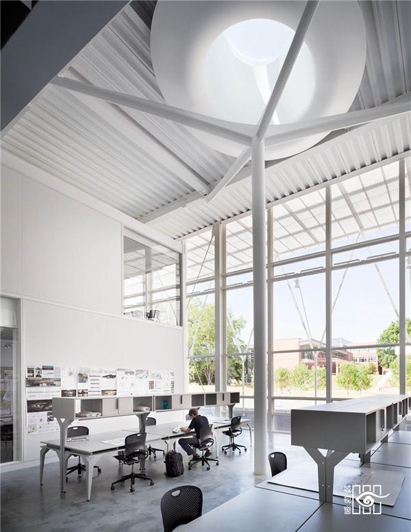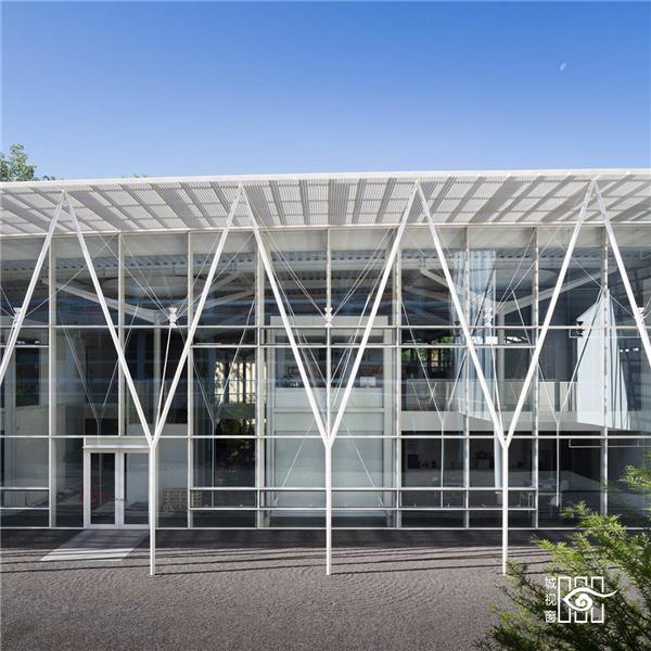 建筑师将所有的功能紧凑排布,使得产生丰富的交流。多学科的学生混合在一个社区内的 环境就像“异花授粉”,在多元化的背景下进行交流。精心设置的玻璃幕墙做到尽可能的透 明,使得内外边界模糊。幕墙的窗户可以灵活开启,与自然紧密联系。