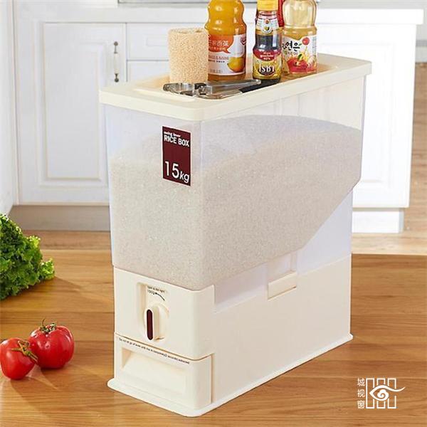 厨房里还应该有的盛装米桶,翻盖的设计可以放一些调味瓶,透明的设计当然是能比较直观的看到米的情况了,比如长虫什么的的都逃不过我们的眼睛啦,另外,还有可以计算米粒重量的功能,妈妈再也不用担心我饭煮多啦!
