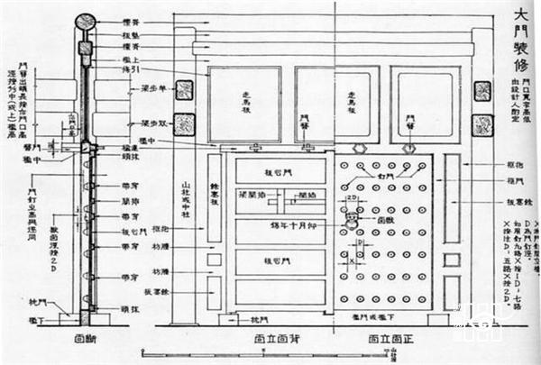 镜面板门属于较好作法,不用木框,完全用厚木板拼合。板门的外面光平无缝,不起任何线脚。有的大门门板常用二寸或三寸木枋拼在一起,背后用销或是打眼穿销。一般王府、宮殿等古建筑门板在背后钉销带之外,还在正面使用门钉。清代门钉路数有規定,如七路,每路用七钉。除此之外,城门门板使用铁皮和铁钉。