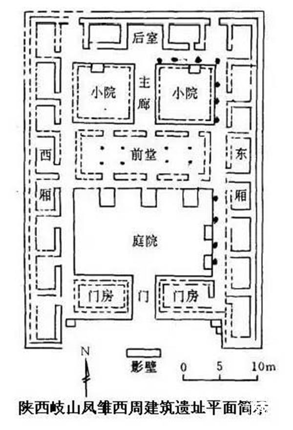 西周建筑技术上最突出的成就是瓦的发明,出现了半瓦当。此外还出现了铺地方砖和三合土墙体抹面。陕西岐山凤雏的西周早期遗址是我国已知最早型型制最严整的四合院建筑。二进院落,中轴对称前堂后室,大门前有影壁。
