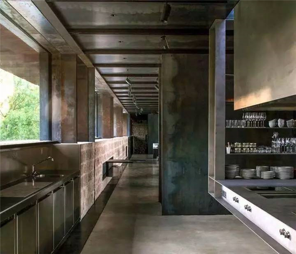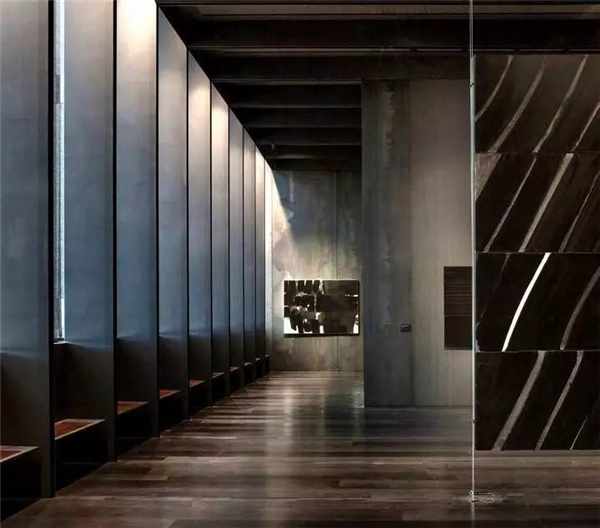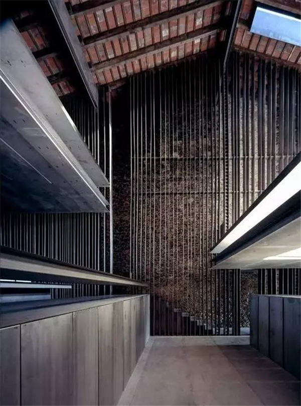 通往品酒室的酒庄内景。金属板将空气、光线和雨水引入室内,创造变化无穷的光影效果。