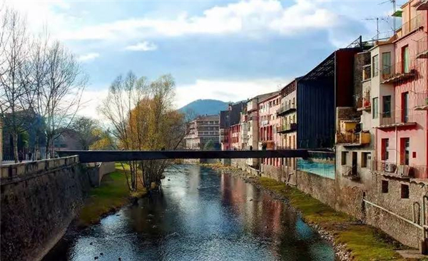 新里拉的建筑主体结构勾画出跨越河流的取景框,面向城镇的新区和身后的远山。走近由RCR设计的全新耐候钢步行桥,穿过河流,形成一条来往老城区的通道。