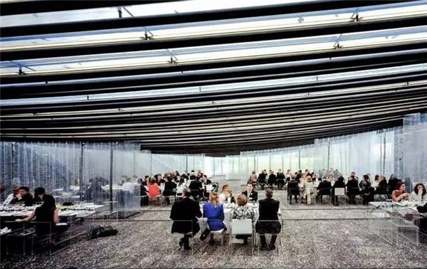 为了重拾往日家庭与朋友乡村野餐的美好时光,RCR 为西班牙奥洛特市的Le Cols 餐厅创造了一个半开放的活动与宴会空间。依循地形掏空嵌入使得整个建筑不过分突出,同时让火山区乡村的美丽风景环绕四周。开掘过程中挖出的石头物尽其用,变为了场地的墙篱、路堤与路面。整个空间可以容纳上百人,屋顶采用轻盈透明的材料,却足以抵挡各种恶劣天气。钢制悬索支撑的屋顶宛如一幅“悬浮”空中的画面;同样,几乎隐形的亚克力材质家具让人、美食与乡村美景成为主角。