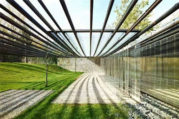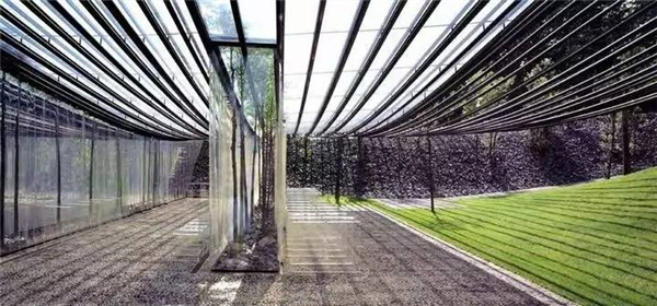 轻盈的屋顶由一系列管子排列而成,管子由于自身的重量而弯曲,沿着树林两侧的石墙支撑着整个屋顶。