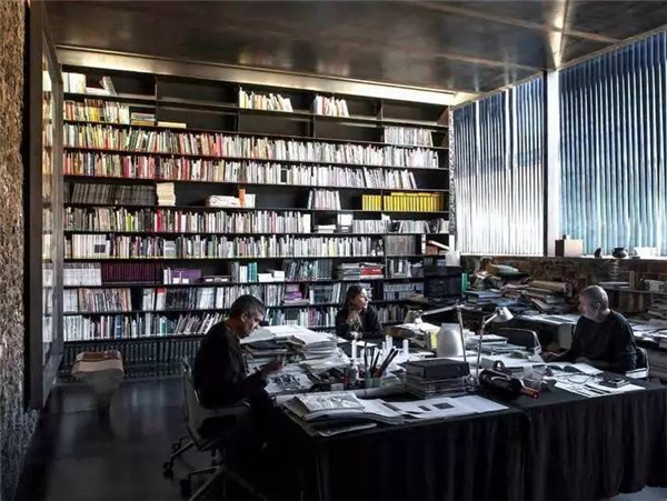 拉斐尔·阿兰达、卡莫·皮格姆和拉蒙·比拉尔塔共享的工作空间是一个图书馆,中间有一个大桌子,正适合三人长时间的讨论交流。