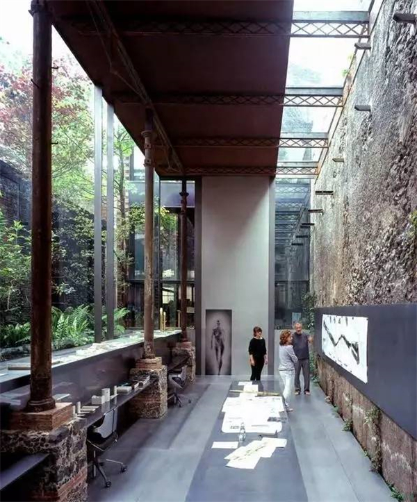 始建于20世纪初的老Barberí 铸造厂于2004年被三位建筑师买下,并改造为他们的工作室,他们乐于称之为Barberí 实验空间。之前的建筑因为火灾留下被烟熏黑的墙壁、屋顶和地面。旧熔炉和烟囱本身的材质、呈现的颜色、散发的味道都为这个新项目提供了有力的启发。办公室有三个主要区域,占据建筑一侧的是双层高顶的图书馆,建筑的第二个入口延伸至庭院,院中设有工作位,以及一个由铁管柱子支撑的全新玻璃大厅。原始的材料-木头、石头和陶瓷 -与新的材料钢和玻璃形成鲜明对比和互动对话,新材料为了原始建筑增添了新的功能和启发空间。内部庭院空间的树丛和植物既成为建筑与自然的分界,也是两者之间的桥梁纽带。