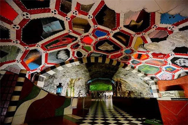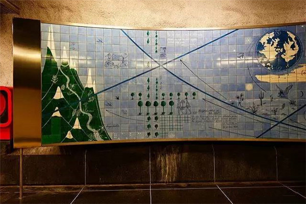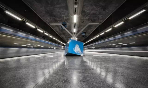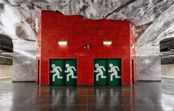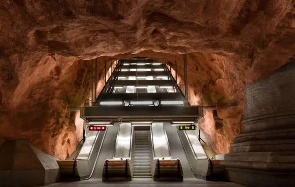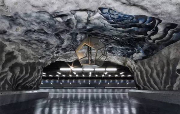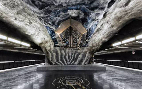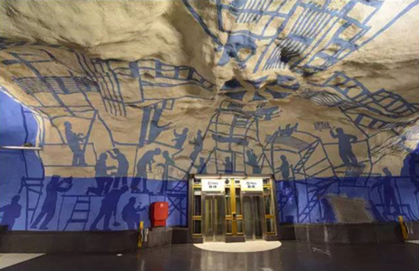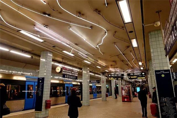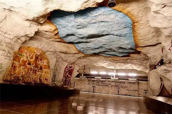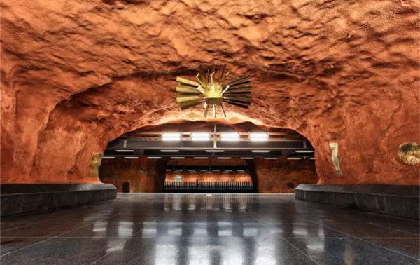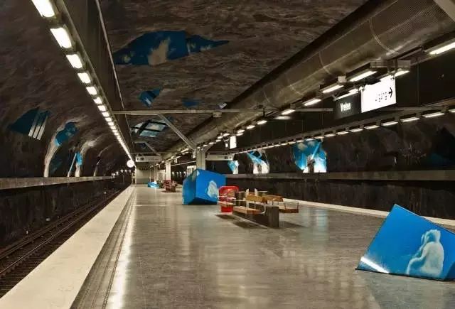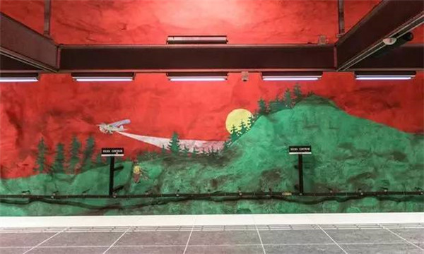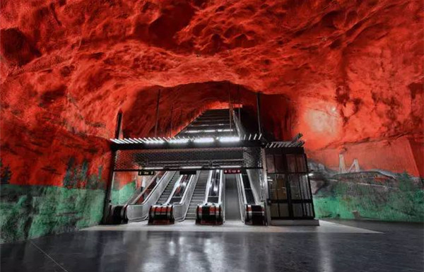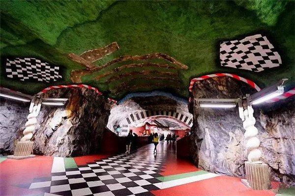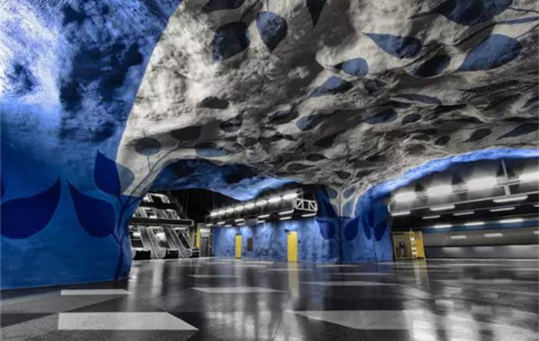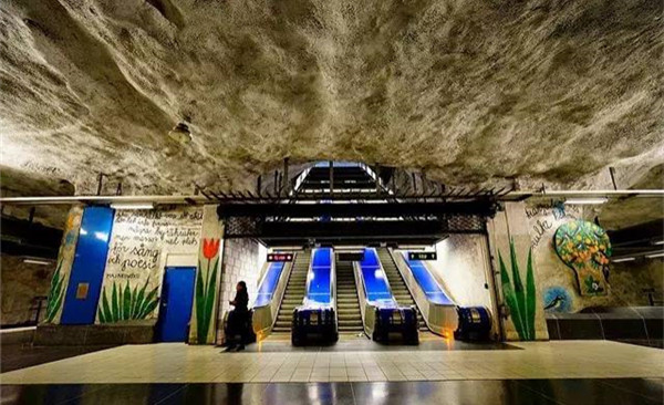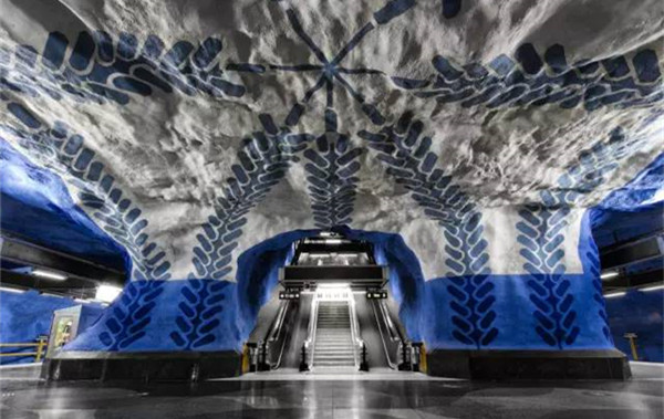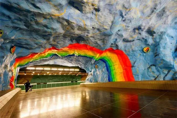 这座地铁站的七彩墙绘是为了纪念1912年在斯德哥尔摩举办的奥林匹克盛事而设计。整座地铁站岩壁都被明亮的天蓝色铺满,而一弯旖旎的彩虹横跨于拱形岩壁之上。除此之外,地铁站里还有着许多色彩斑斓、情感浓烈的艺术作品,例如封面图片中花团锦簇的多边形墙饰。