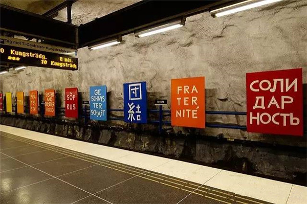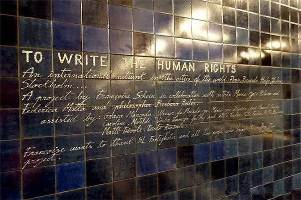 临近斯德哥尔摩大学,深蓝色的瓷片上,写着联合国人权宣言的内容,还有充满人文气息的绘画,和极具艺术感的装饰物。