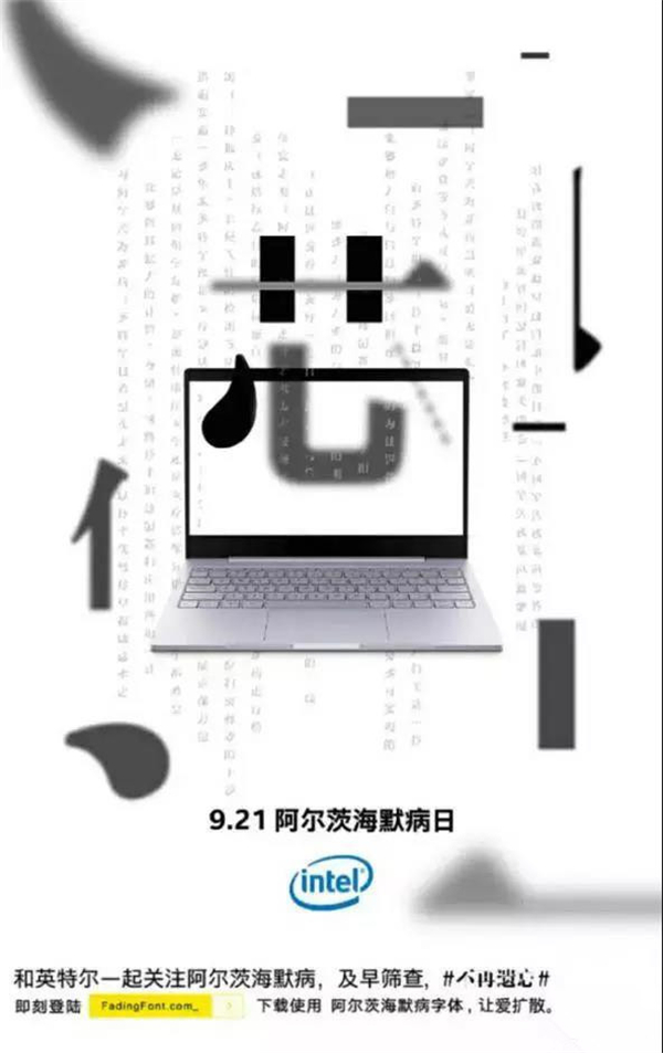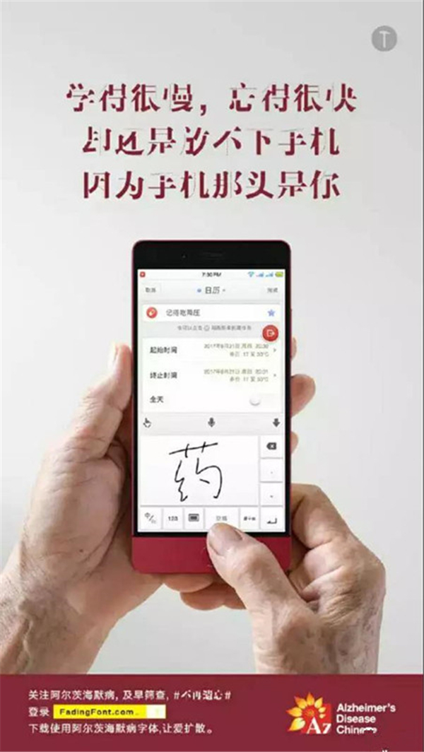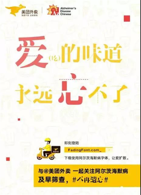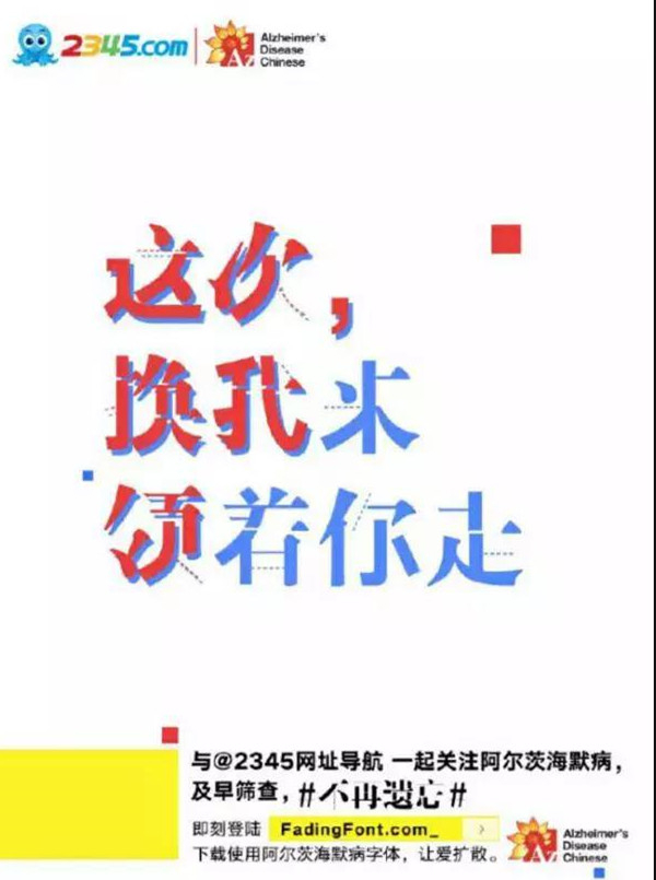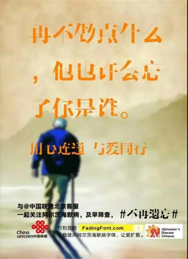 在字体设计中,”缺”元素运用的相当广泛。两个月前,一组以“不再遗忘”为主题的公益设计,第一时间抓住了公众的眼球。几十余家品牌自发参与制作,他们以缺失笔画的独特设计,抓住阿尔茨海默病人杂乱无章的病源心理,在画面上营造一种浓浓的关爱感,从而号召大家进一步关注阿尔茨海默病。