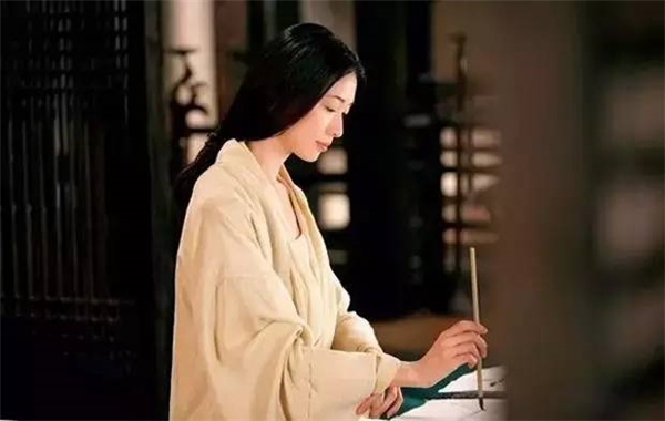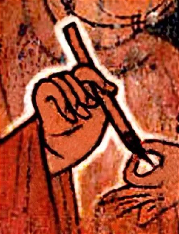 ▲图中仙女大拇指与食指执笔,中指、无名指与小指皆不拈笔杆,为典型的二指单钩(单苞)式执笔法。