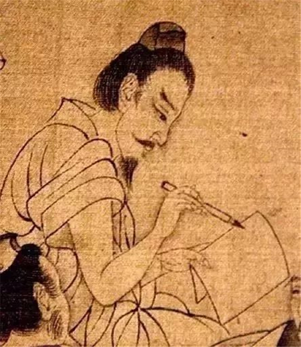 ▲此图中执笔,大指与食指执笔明显,但中指拈不拈笔杆便难以确定。如从同一作者所作《斫琴图》中的执笔方法来推断,中指应不拈笔杆,可判为二指单钩式执笔法。