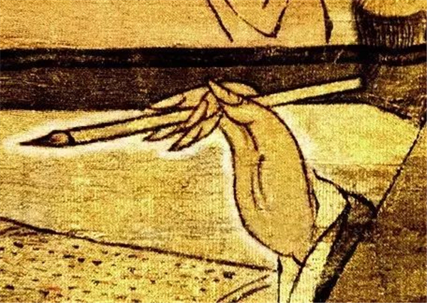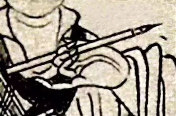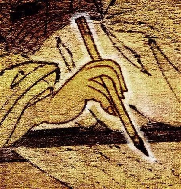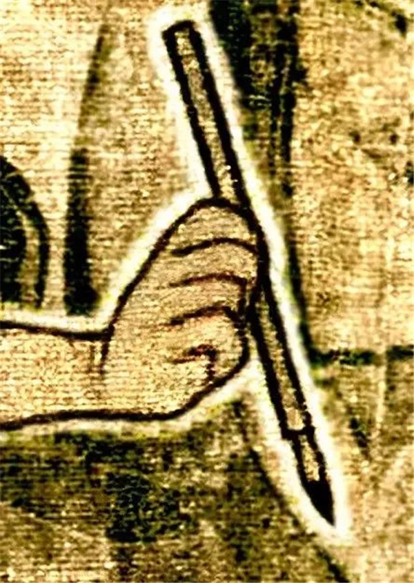 ▲顾恺之《斫琴图》的执笔,清楚显示为二指单钩的执笔方法。其所执之笔有竹笔的可能。但毛笔与竹笔的执笔方法,相同的可能性很大。