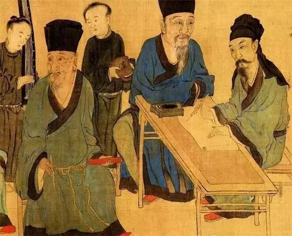 ▲此图中两位学士皆大拇指与食指、中指执笔,无名指与小指一般不拈笔杆,所以判断为三指双钩式的执笔法。