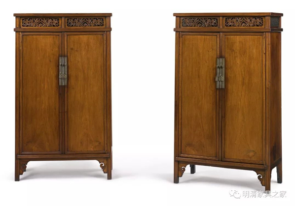 圆角柜以“圆”作为主旋律,柜帽及各处的转角都为圆角,且整体材料几乎都为圆料制作,四角、四框都有圆。如圆角柜的细微处虽有不同的设计,但也都设计成方中带圆的结构。例如图中三个圆角柜中,虽然侧棱立柱呈现了不同的风格,有甜瓜棱、圆弧状棱和双起鼓棱等。会让人感觉到一种圆润中的力量之感。方中带圆,圆中有方体现了圆角柜设计的精妙。各部件之间的随圆就方,随方就圆,体现出一种局部呼应整体之感,表达了一种含蓄、礼貌、地道的儒家学的观点。