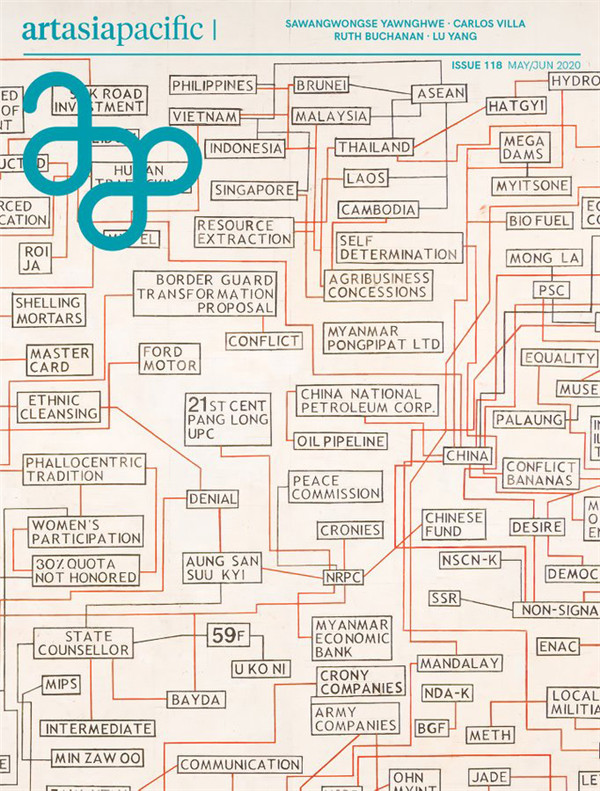 萨望翁·雍维长久以来将家族档案作为根基,致力于呈现被缅甸政府试图抹去的掸族历史记忆。而本期封面中的画作以错综复杂的的线条与文字框,勾勒出缅甸境内政府、公司、组织等之间的关系网络,表达了艺术家对政府设下复杂管理方案、却对实现和平的基本道理置之不理的莫大嘲讽。