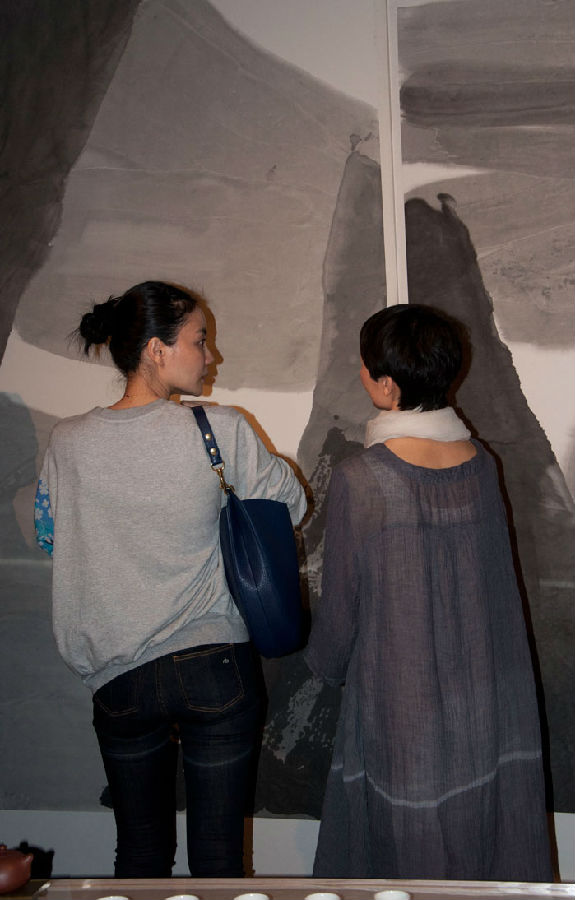 王菲和朋友观看书画区展览作品。