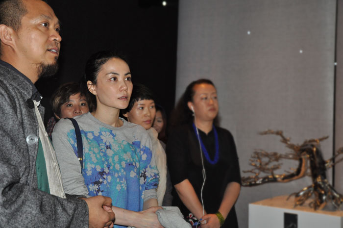 艺术家卓凡教授向王菲讲解其玉雕作品。