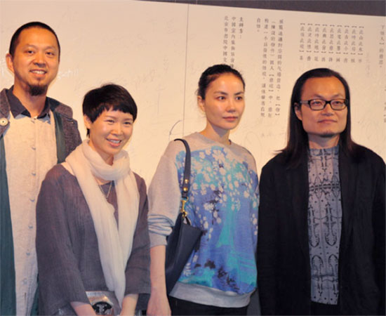 在签到处签到后,王菲与主办方合影,从左往右依次为中央美院卓凡教授、中国陈设艺术专业委员会赵寂蕙秘书长、策展人佘文涛先生。