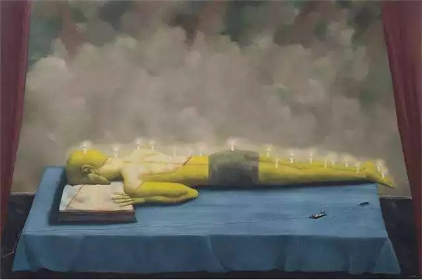 “《重生之门》是佛教里千灯求法的一个故事。我看到这个故事时,很感动,一个人为了接近他的信念,他用“燃千灯”的方式去报答,这很有画面感。这张画的主题,可能跟死亡有关,但是从佛教的角度讲,没有真正的死亡,都是一个轮回。”